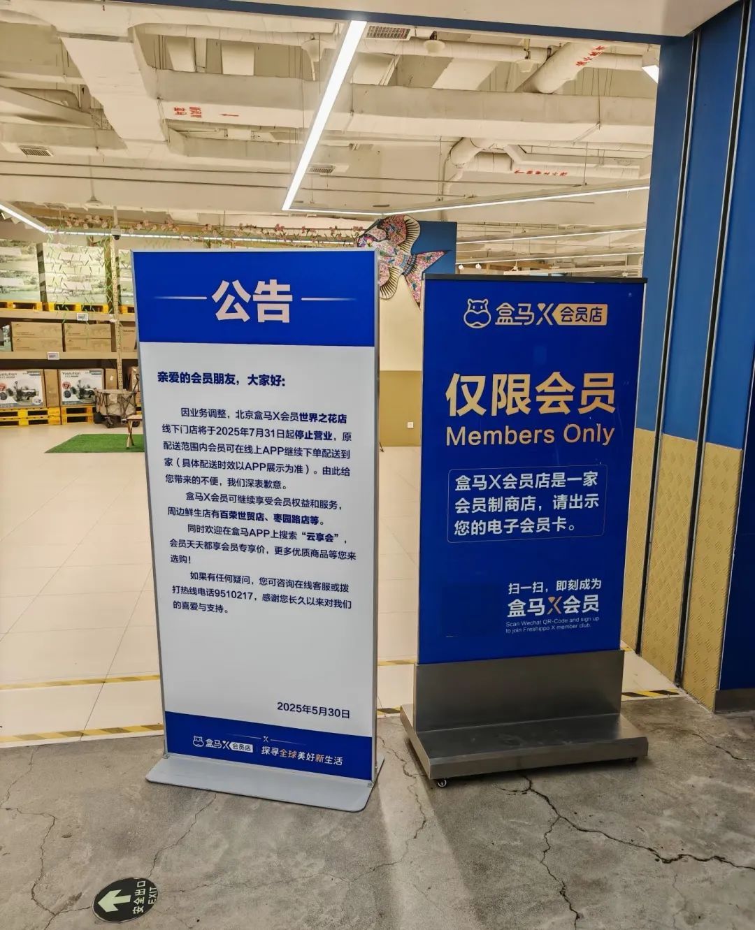 7月29日,盒马X会员店北京世界之花门店公告称,两天后的7月31日停止营业;同一天,苏州相城店、南京燕子矶店也同步闭店。此后,全国仅剩的上海森兰店,据客服确认也将于8月31日停业——这意味着,盒马所有X会员店将彻底退出舞台。